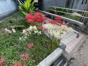 松山陸上競技場のトイレ前に彼岸花が咲いています。
