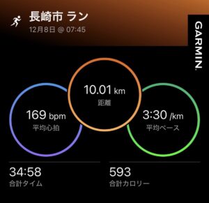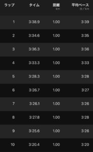 5キロ以降は3:30/kmを切るスピードになったが、そのままのスピードを維持。