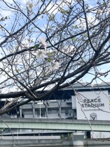 スタジアムの浦上川を挟んだ木に桜が咲いていました。