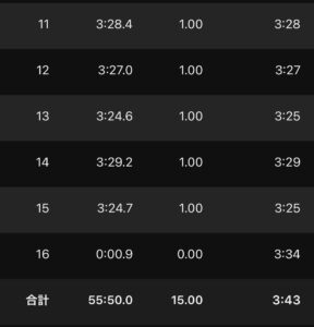 いきなり上げるときついので、10キロ目は3:36/kmに少し上げた。