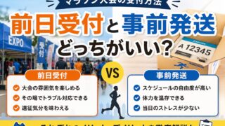 お役立ち情報 マラソン大会の「前日受付」と「事前発送」どっちがいい?メリット・デメリットを徹底解説 いつも購読ありがとうございます。今回はマラソン大会の受付についてです。マラソン大会にエントリーする際、見落としがちですが重要なのが受付方法です。「前日事前受付」か「事前発送」かによって、大会前日の過ごし方や当日のコンディションは大きく変わり... 2026.04.30 お役立ち情報