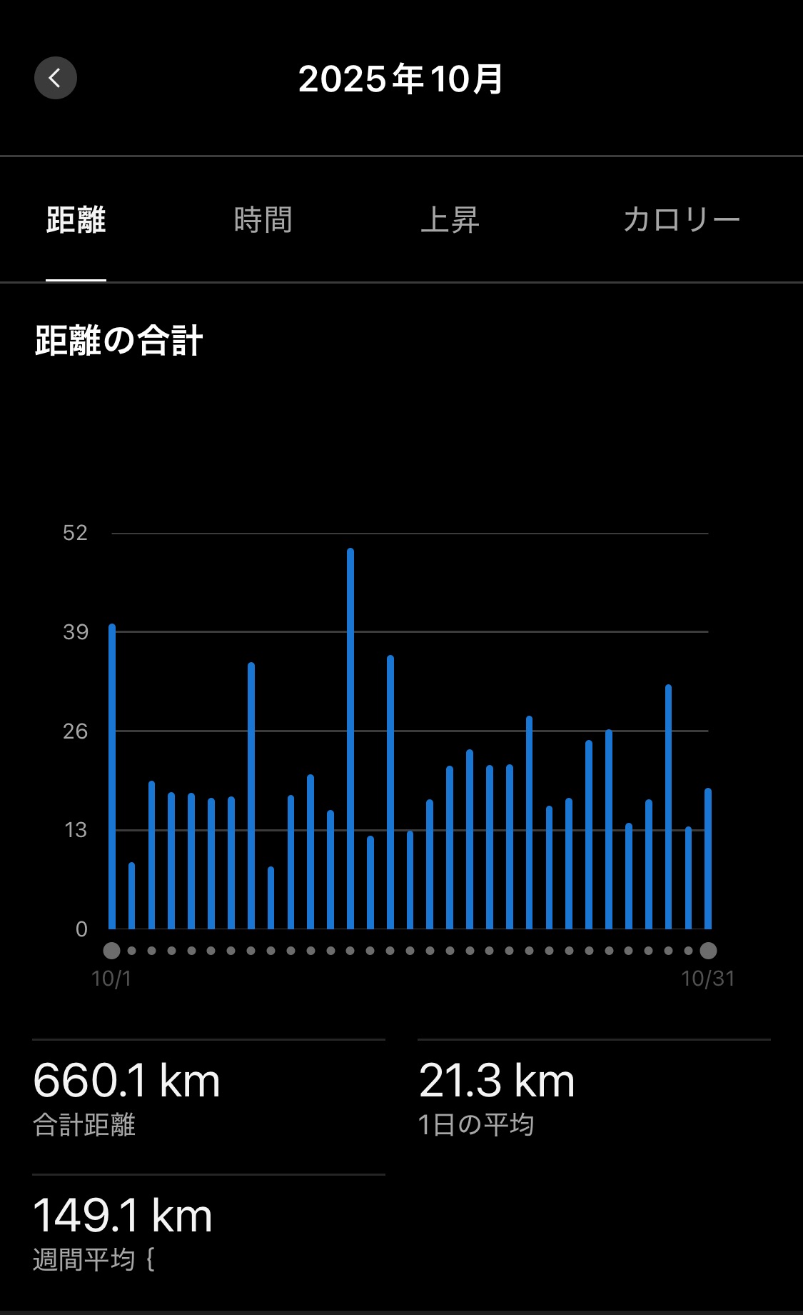 10月の走行距離は660.1キロで月間記録を更新しました!