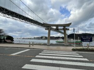 トンネル入り口から海側を見ると鳥居と関門橋が見えます。