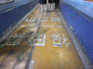 途中に山口県と福岡県の県境が床に記載があります。