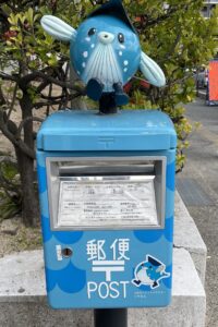 神宮の入口にあった郵便ポストは青くてふぐでした。