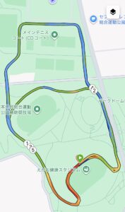 アップダウンがあるので、3、5キロはラップが落ちたが、ラストの約500mは下り坂&競技場で、2:55/kmまで上がった。