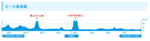 ハーフ手前の20キロ手前から最初の難関の九大の上りがあり、上り切ったとこで折り返し。