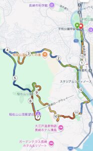 松山陸上競技場から梁川公園の交差点から稲佐山へ、帰りは稲佐橋に降りてくるコース