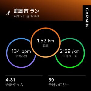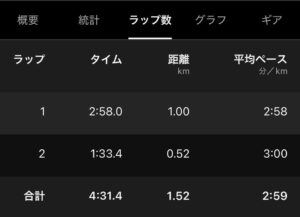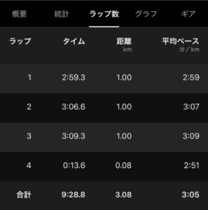 Garmin上ではキロ3では走れたが、記録としては4分31.60。