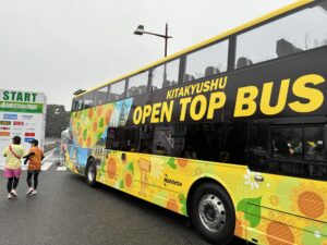 北九州市では2026/3/27よりオープントップバスが運行するらしくて、そのPRのためか、このバスにゲストの方が乗車していてオープニングセレモニーをしていました。