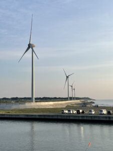 福島の事故があった場所からか、再生可能エネルギーの普及が進んでおり、かなりの数の風車が建っていました。