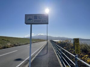 雲仙まで38キロ、島原まで37キロの看板があります。