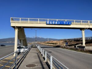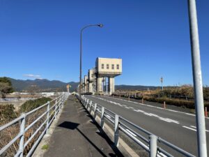 しばらく進むと堤防道路の看板が出てくるので、左に曲がります。