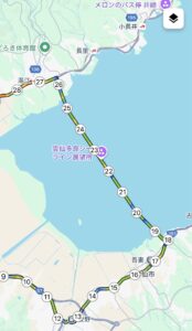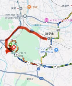トランスコスモススタジアム→国道57号→国道251号→諫早湾干拓堤防道路→国道207号→トランスコスモススタジアム