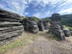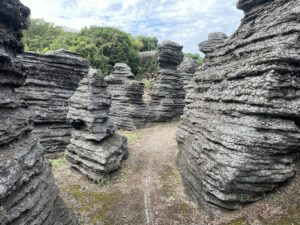 長崎県西海市にある「七ツ釜鍾乳洞」に隣接する「化石の森」は、日本でも珍しい石灰岩に化石が多数含まれる地層が観察できる場所です。