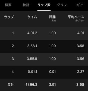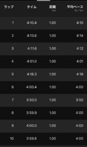 キロ4一定で走ったつもりが、少しずつ上がっていた。