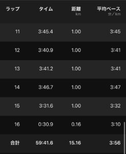 ラスト1キロは余力があったので、3:32/kmまでペースアップ。