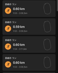 1本目は何とか1分48秒(3:02/km)で走れたが、めちゃくちゃキツイ。