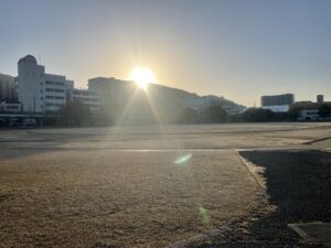 練習後は日が昇ってきて、様々な松山陸上競技場を楽しめた。