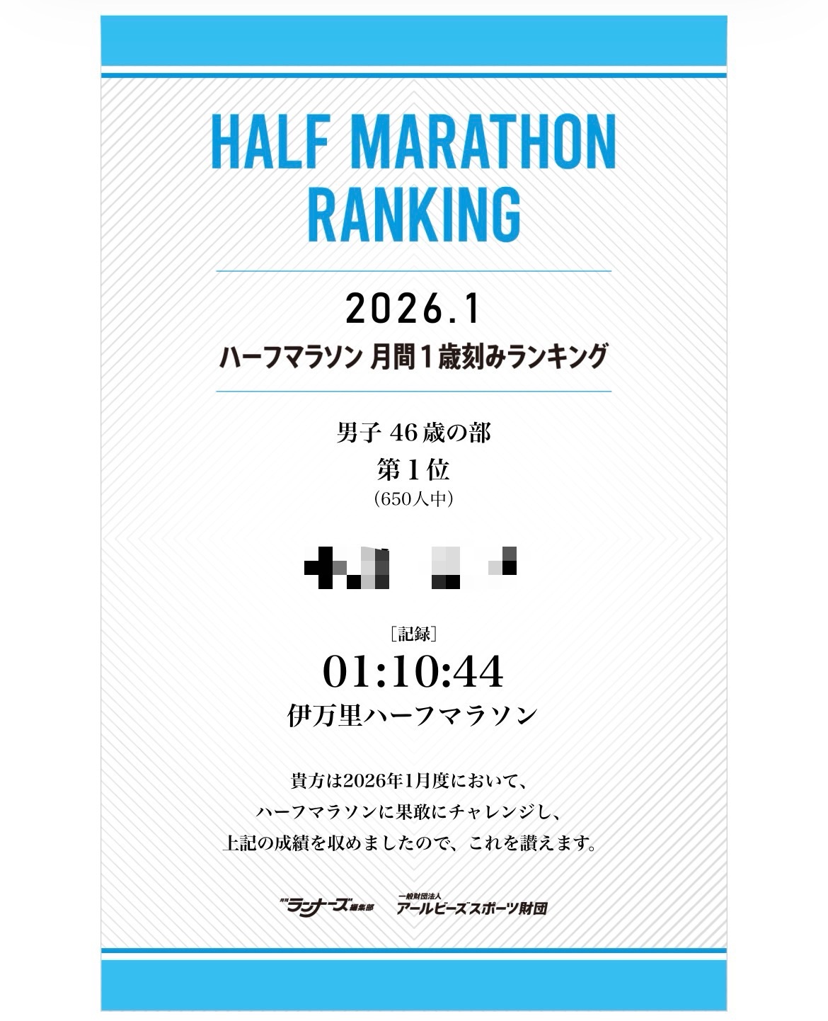2026年1月の月間1歳刻みランキングが発表されフル&ハーフが発表され全国ランキング1位になりました。