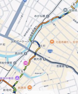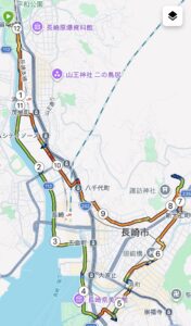 松山陸上競技場発→湊公園→新地中華街→浜町アーケード→眼鏡橋→西山神社→松山陸上競技場