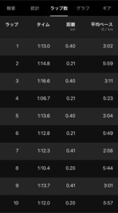 1000mは4:10目標だったが、皆さんスピード上げてたので、それに合わせていたら少しペース上がった。
