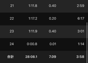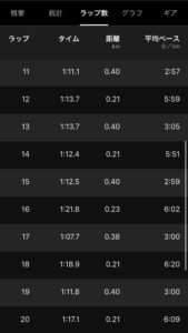 ※9本目(ラップ17)はGARMINの押すボタンを間違えて、距離が短くなっています。