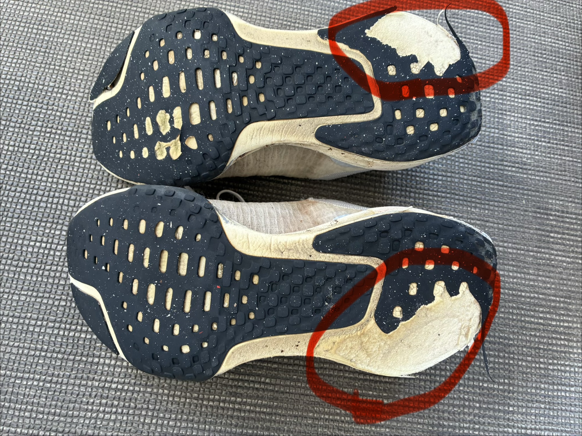一方で、ポイント練習、レースで使用しているヴェイパーフライ3は、つま先の方が摩耗しています。