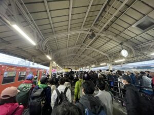 また、この日は臨時便が出ており、6、7時台は10分に1本電車が出てます。