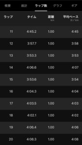 14キロ目に給食があって、写真撮ってたので、ラップが落ちています。