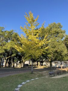 松山陸上競技場のイチョウもだいぶ黄色くなってきました。