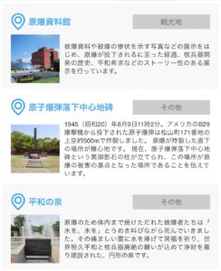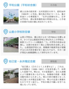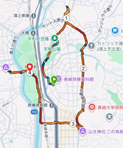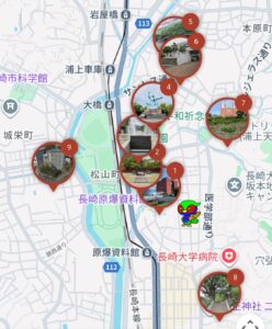 原爆資料館→原爆落下中心地碑→平和の泉→平和記念像→山里小学校防空壕→如己堂 →浦上天主堂→被爆クスノキ→城山小学校平和祈念館