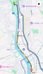 松山陸上競技場から出島メッセまでは2.6キロ程度。