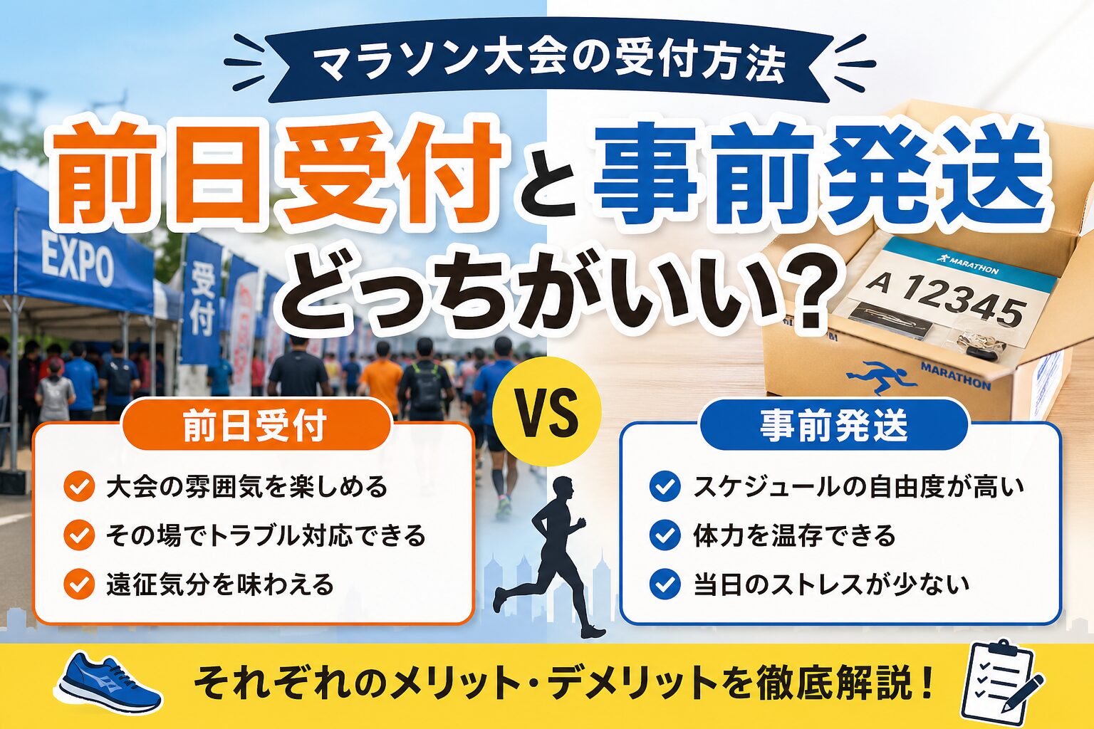 「前日事前受付」か「事前発送」かによって、大会前日の過ごし方や当日のコンディションは大きく変わります。