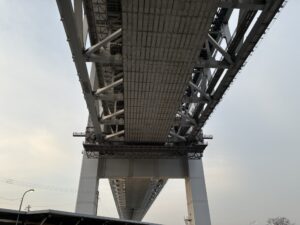 この橋の大きな特徴は、道路と鉄道が上下二層構造で併設されている点です。
