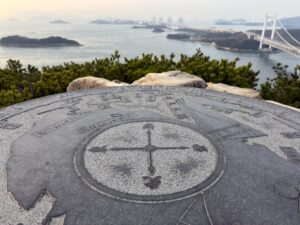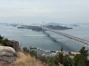山頂付近からは、穏やかな海が広がる瀬戸内海と、そこに浮かぶ大小の島々、そして本州と四国を結ぶ壮大な瀬戸大橋を同時に望むことができます。