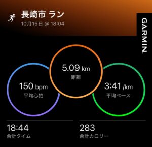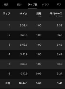 アウトを走ったので、GARMINのペースは若干速いが、ゴールタイムは、きっちり3:45/kmペース(18分44秒)だった。